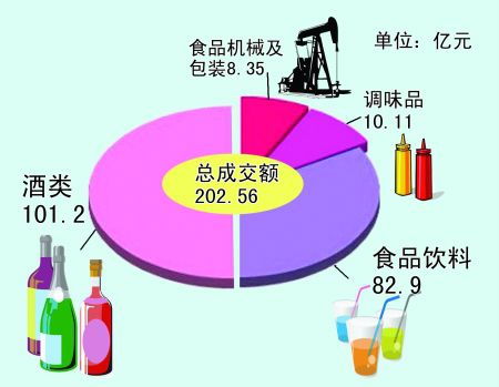 本届交易会商品成交总额为202.56亿元,其中,酒类成交总额为101.2亿元,食品饮料成交总额为82.9亿元,调味品成交总额为10.11亿元,食品机械及包装成交总额为8.35亿元。